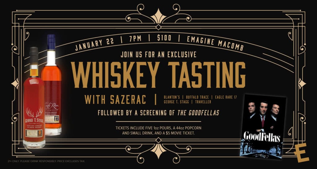 Join us for an exclusive whiskey tasting experience at Emagine Macomb on January 22nd. This exclusive whiskey tasting event, hosted by Sazerac—one of the most renowned names in American whiskey—offers a unique opportunity to savor Sazerac’s iconic craft spirits in the comfort of a luxurious theater setting.